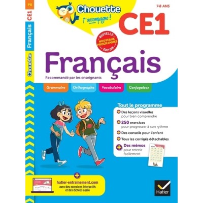 Un cahier pour réviser tout son programme de français en CP et s'entraîner à son rythme, de manière accompagnée. Conforme aux nouveaux programmes de l'Education Nationale, le cahier est rédigé par des enseignants. - Pour chaque point clé du programme scolaire, votre enfant retrouve : - des leçons simples et visuelles, - des exercices progressifs, avec des aides pour comprendre et réussir. - des mémos permettant de mieux mémoriser les notions essentielles. - des conseils de méthodes et astuces de la petite Chouette ! - Un test permet à votre enfant de se situer sur les compétences attendues en grammaire, orthographe, vocabulaire et lecture. - Des informations sur le programme et des conseils parents dans chaque page vous aideront à accompagner votre enfant dans son travail et son organisation. - En complément, dans un livret détachable, vous trouverez les corrigés des exercices, - L'achat du cahier permet d'accéder gratuitement au site d'entrainement www. hatier-entrainement. com et à ses différentes ressources, dont des exercices complémentaires interactifs et des dictées.