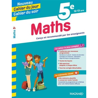 Le cahier le plus complet pour faire le lien entre le collège et la maison en maths - Tout le programme de 5e pour comprendre et s'entraîner - Nombres et calculs / Gestion de données / Grandeurs et mesures / Géométrie / Algorithmique et programmation - Une structure claire et efficace pour couvrir toutes les notions du programme - Les règles à retenir et de nombreux exemples -300 exercices progressifs pour vérifier l'acquisition des connaissances et les mettre en pratique - Des astuces et des conseils pour tout maîtriser - Tous les corrigés détachables au centre du cahier - Des mémos visuels pour maîtriser l'essentiel sous forme de schémas et cartes mentales : critères de divisibilité ; symétrie centrale, construction du symétrique ; gestion de données ; proportionnalité ; triangles ; fraction - Des compléments numériques gratuits : des quiz interactifs